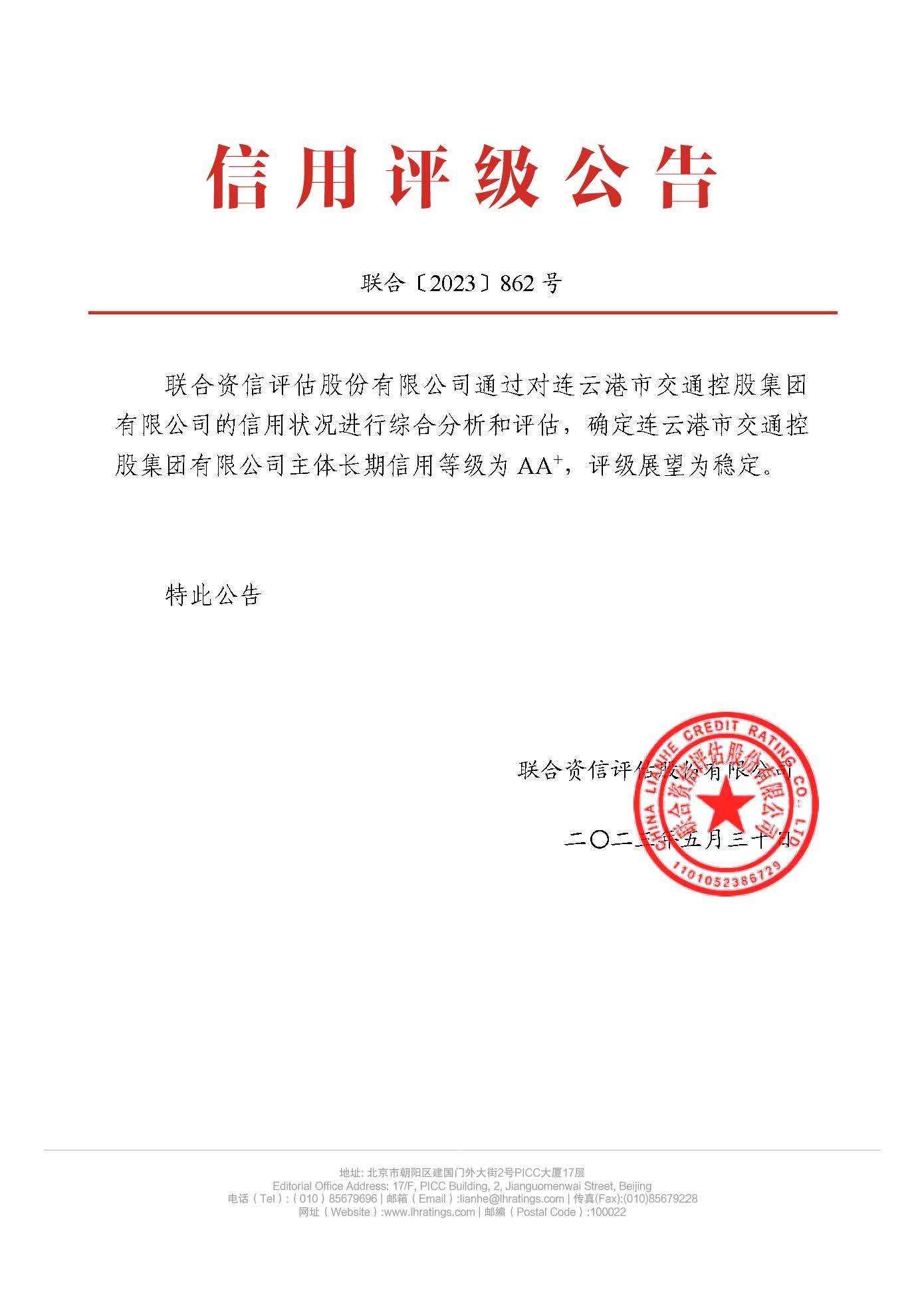 近日,聯(lián)合資信評估股份有限公司發(fā)布信用評級公告,確定連云港市交通控股集團有限公司(以下簡稱“交通控股集團”)主體長期信用等級為AA+,評級展望為穩(wěn)定。