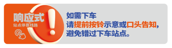 “響應(yīng)式公交”是指線路不再執(zhí)行“逢站必?!?,車輛到站前,要下車的乘客需提前按鈴示意或口頭告知駕駛員。如無乘客按鈴或口頭告知下車,并且??空緝?nèi)無乘客等候、無其他公交車??繒r,將減速越站通過。
