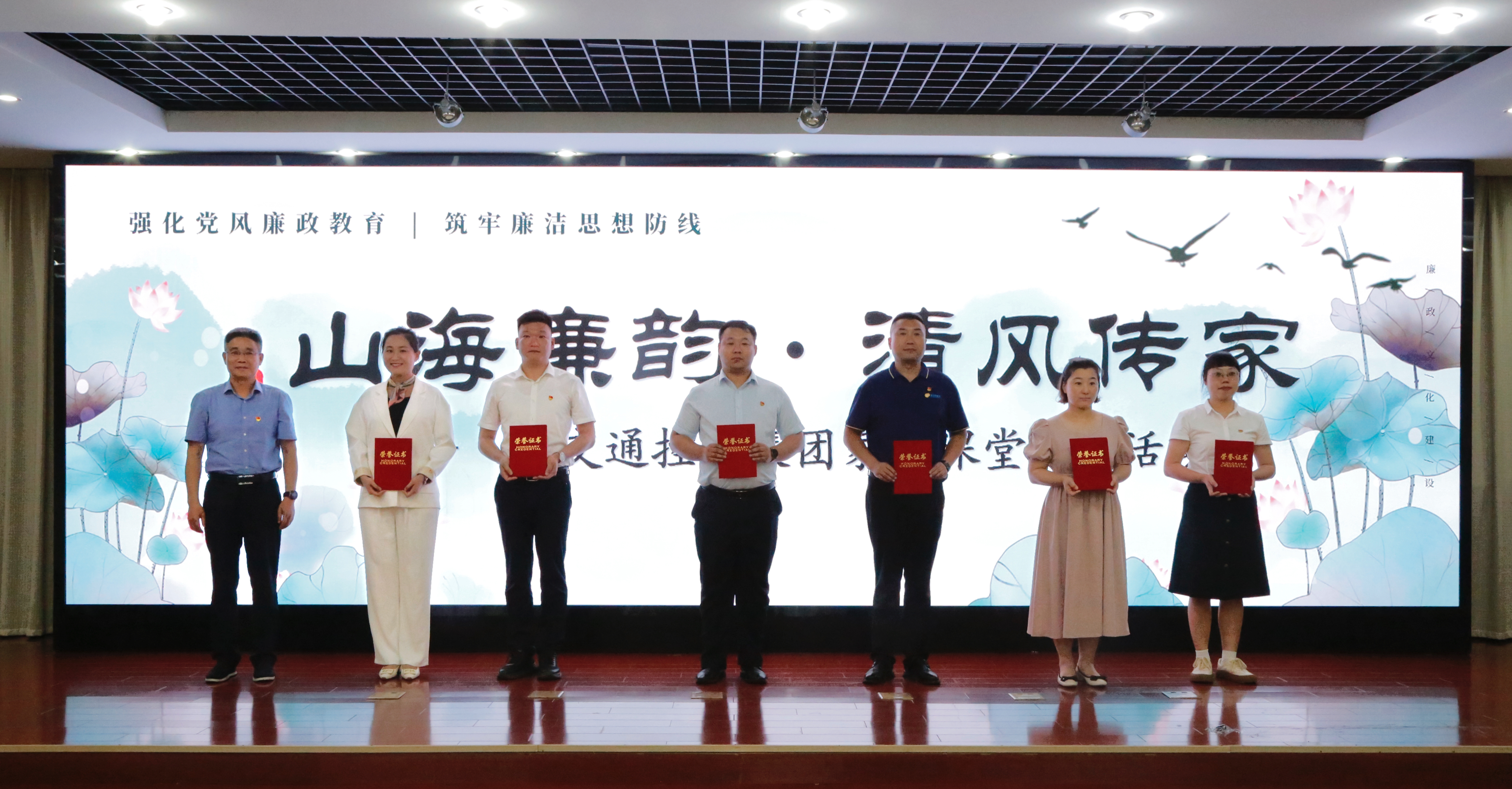 活動最后,集團總經理、黨委副書記、副董事長孫中華向與會黨員干部家庭代表贈閱廉潔讀本,集團黨委書記、董事長仲偉濤組向本次專場活動分享黨員發(fā)放集團“山海廉韻 清風傳家”家風課堂優(yōu)秀分享人證書。