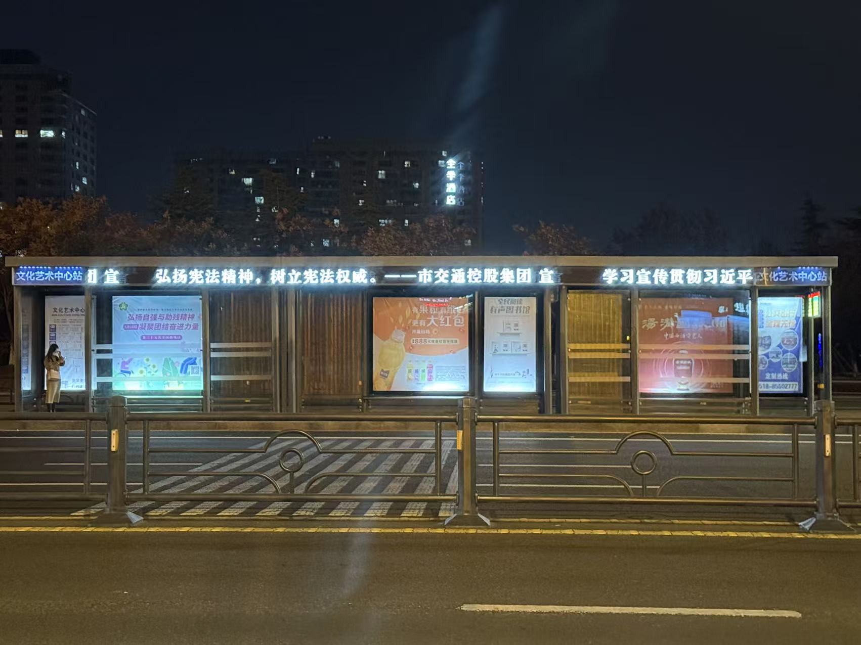 為有效提升法治宣傳的覆蓋面和感染力,交通集團(tuán)精心統(tǒng)籌、周密部署,依托公交站亭LED屏點(diǎn)位多、分布廣、貼近市民的天然優(yōu)勢(shì),在全市人流密集區(qū)域的近百個(gè)公交站臺(tái)同步滾動(dòng)播放憲法宣傳標(biāo)語(yǔ)。“學(xué)習(xí)宣傳貫徹習(xí)近平法治思想,推動(dòng)憲法深入人心”、“弘揚(yáng)憲法精神,樹(shù)立憲法權(quán)威”等醒目標(biāo)語(yǔ)循環(huán)閃現(xiàn),如同一個(gè)個(gè)流動(dòng)的宣傳站,在候車間隙向廣大市民無(wú)聲傳遞著憲法的權(quán)威與溫度,引導(dǎo)社會(huì)公眾深刻理解憲法精神,不斷增強(qiáng)法治意識(shí)。