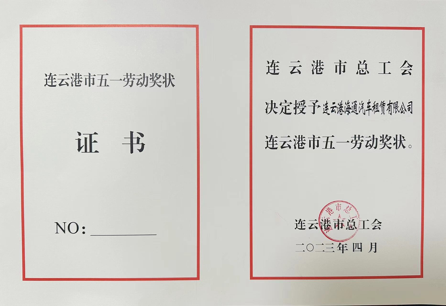 日前,從連云港市總工會(huì)傳來喜訊,連云港海通汽車租賃有限公司榮獲“連云港市五一勞動(dòng)獎(jiǎng)狀”榮譽(yù)稱號(hào)。