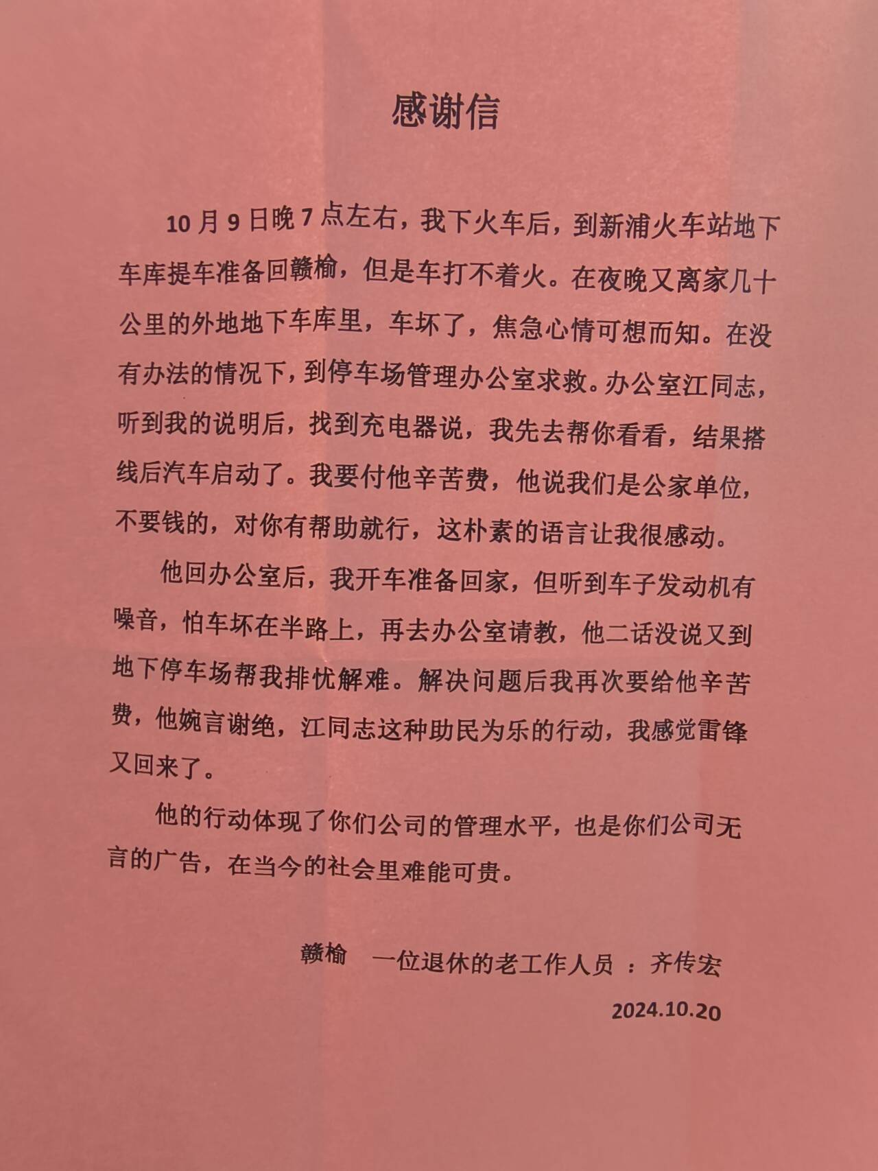 10月23日,連云港豐達(dá)物業(yè)管理有限公司收到了一封來(lái)自贛榆一名退休的老工作人員齊先生的感謝信,信中不僅表達(dá)了對(duì)公司職工江波同志不求回報(bào)熱心幫助自己的感激之情,更是表達(dá)了對(duì)公司物業(yè)管理水平的高度認(rèn)可。