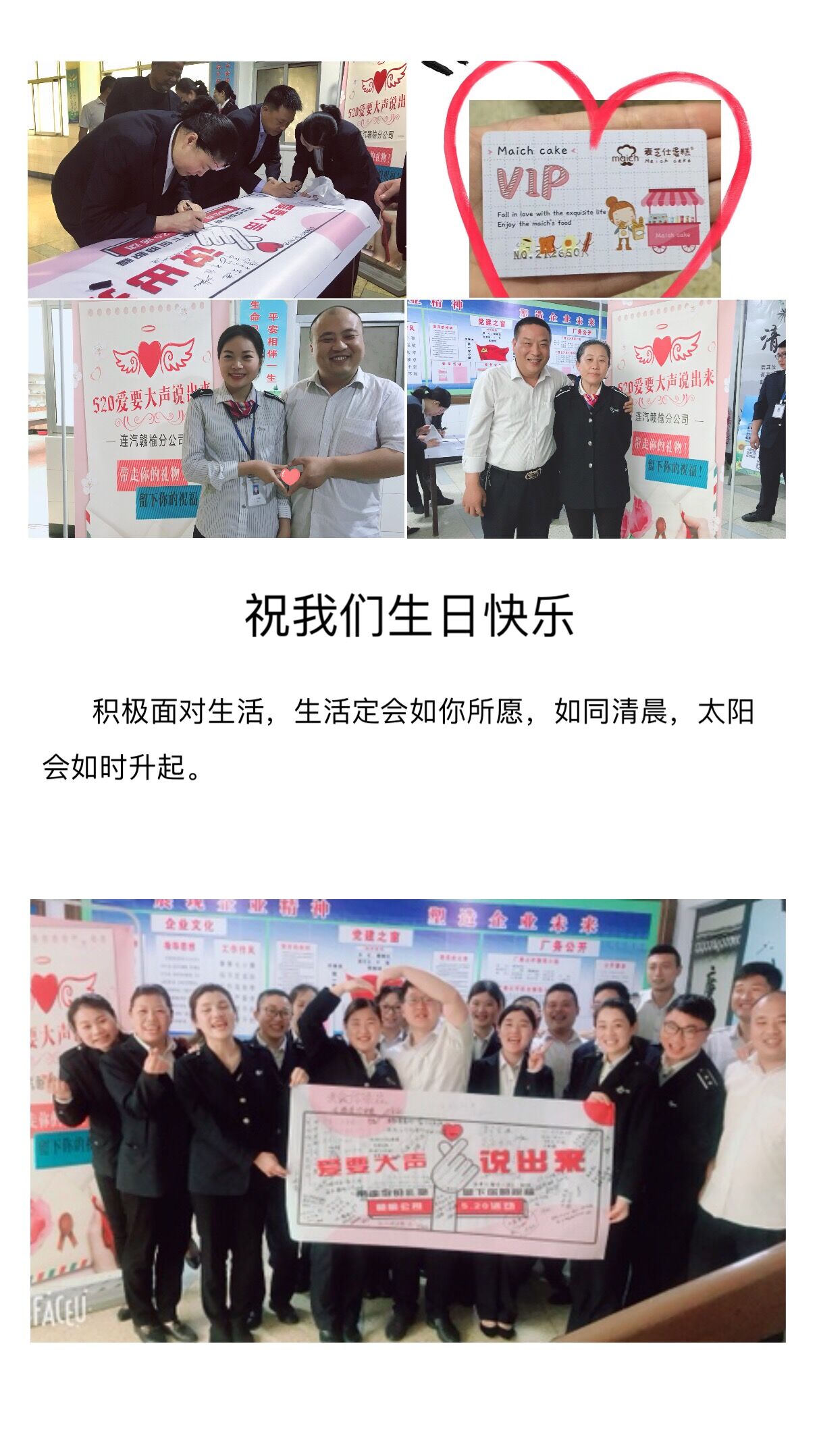 這一個(gè)周末的贛榆公司,與以往一樣安然,卻發(fā)生了不同尋常的浪漫驚喜,一份公司送給職工的溫暖,從這里出發(fā)。由贛榆公司工會(huì)為職工們舉辦的別樣生日祝賀活動(dòng)——給職工們送上生日蛋糕卡,從這樣一個(gè)特殊的日子啟動(dòng)。